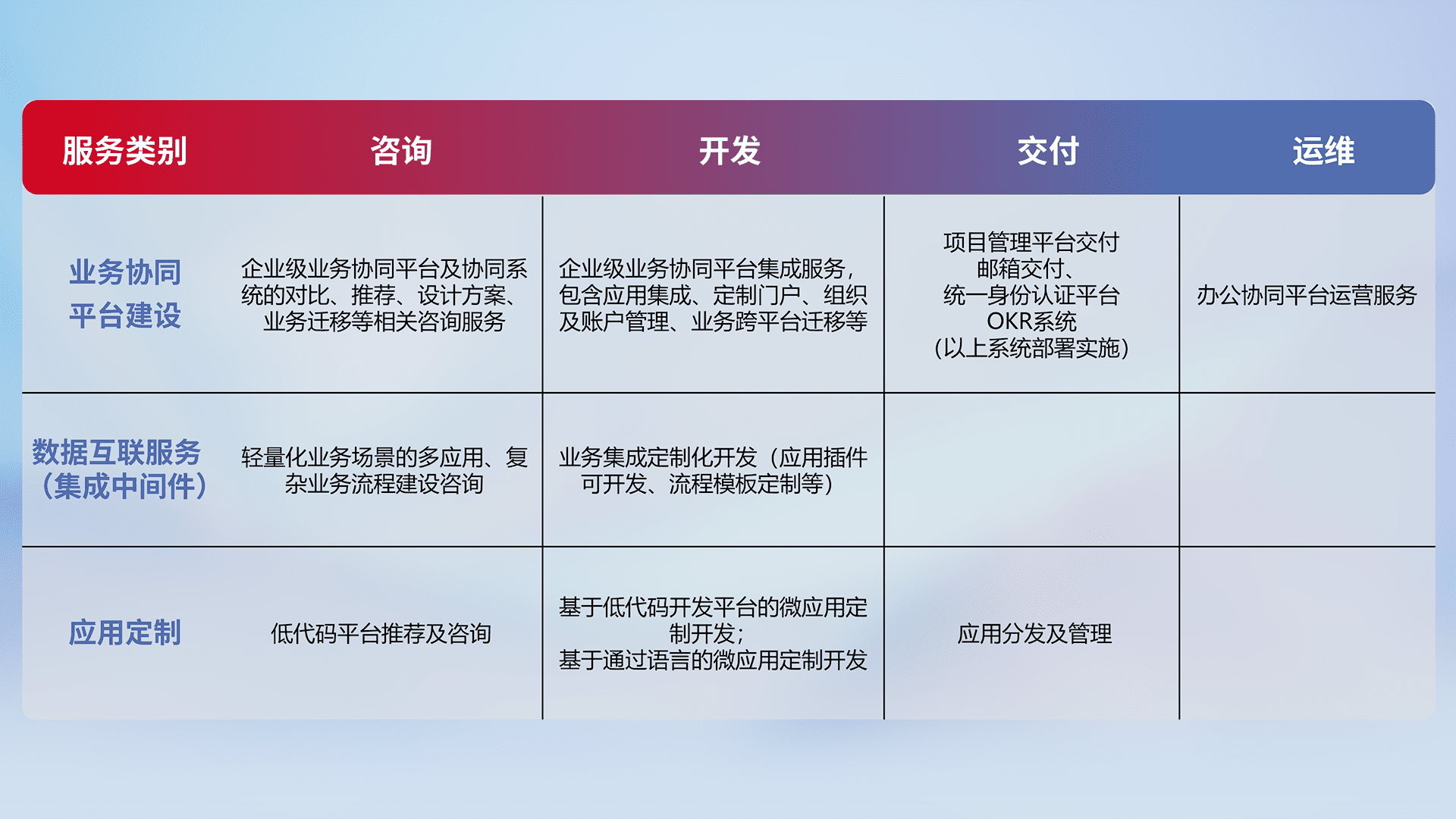 针对钉钉、、、企微、、、、IDaas等平台级产品提供产品的规划、、方案、、交付、、定制化开发等服务,,,,实现如统一协同办公、、、智能客户服务、、、混合会议管理、、、智能数据查询、、、、等业务场景,,,,实现数字化转型。。。。